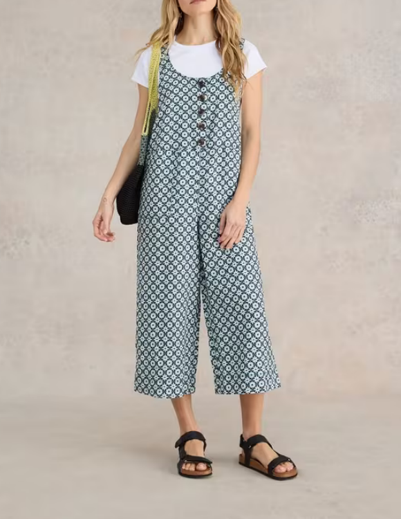 Viola Crop Linen Dungaree In Green Print 164403